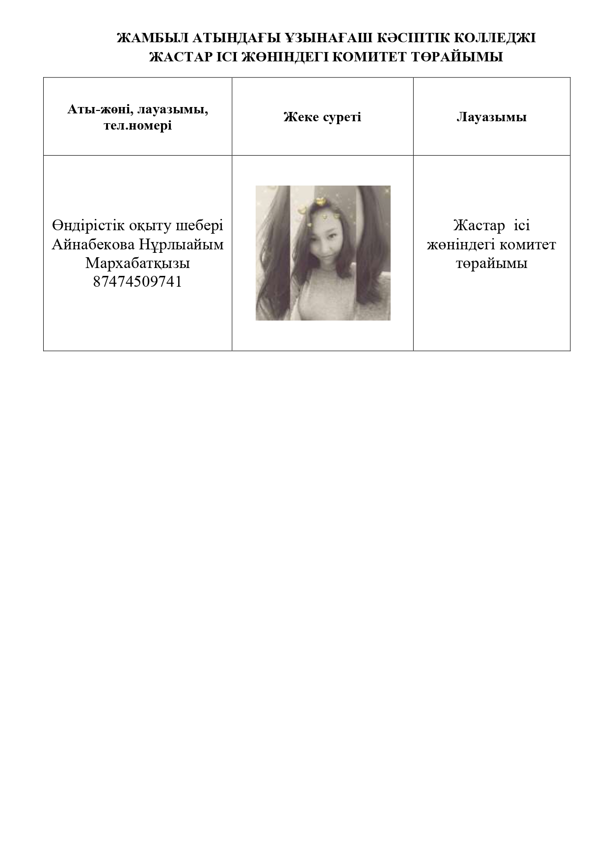 "Алматы облыстық білім басқармасы" мемлекеттік мекемесі "Жамбыл атындағы Ұзынағаш кәсіптік колледжі" МКҚК